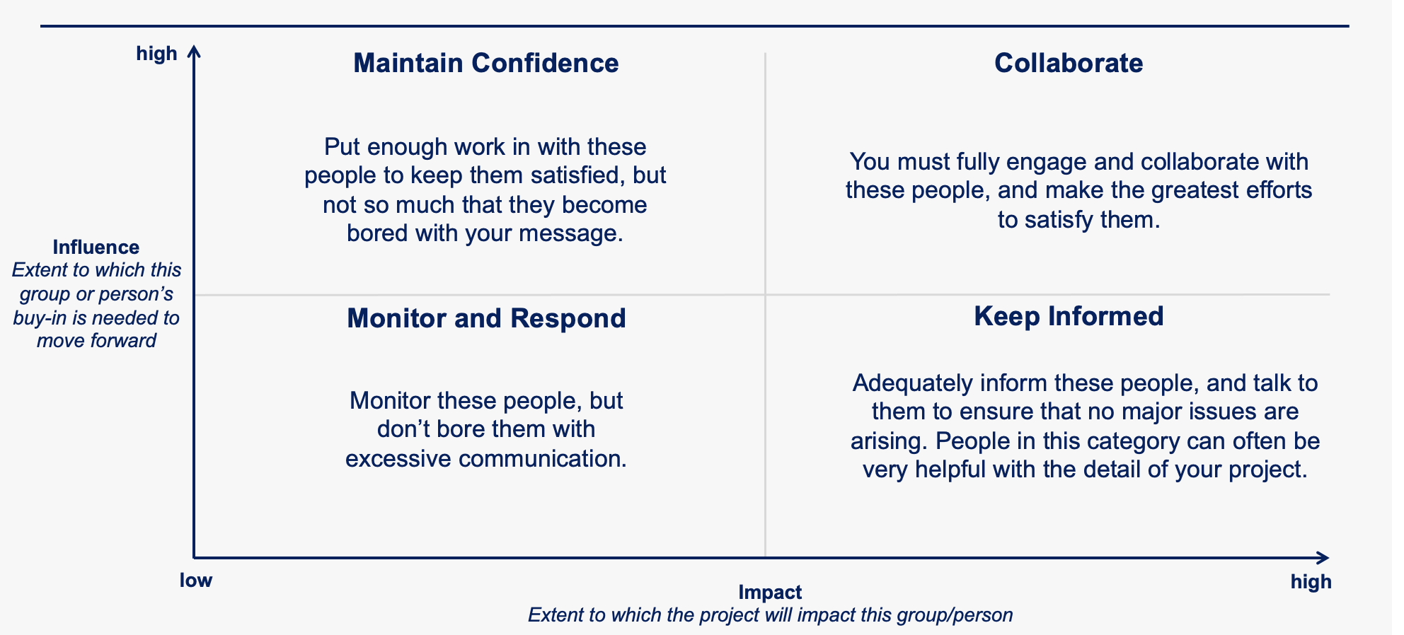• Influence (Extent to which this group or person’s buy-in is needed to move forward)